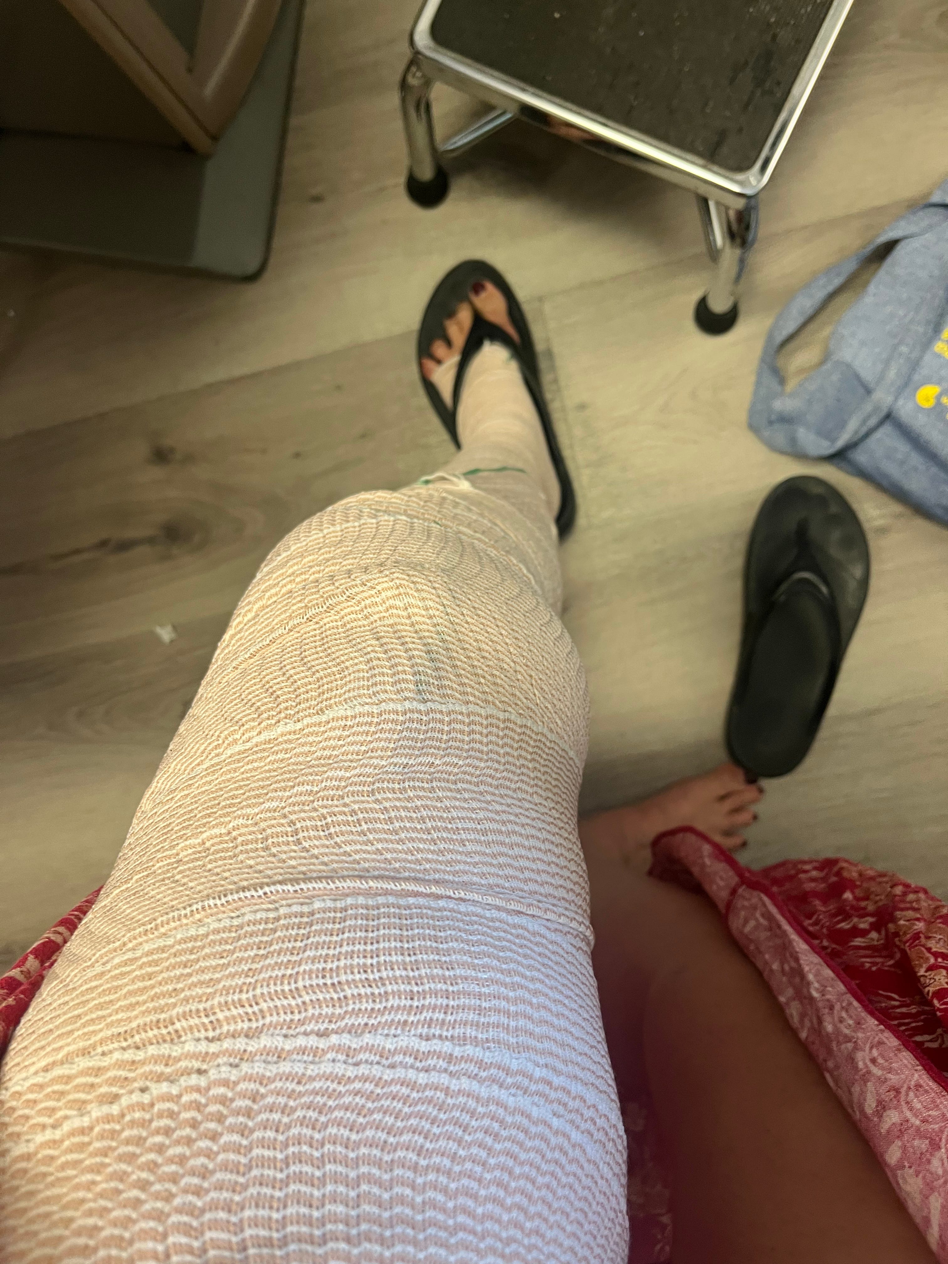 It's a long and not-so-exciting story... An early morning visit to a NYC emergency room. A leg-full of blood clots, a rare but known side effect of my anti-cancer medication. Three separate procedures with a vascular surgeon. My leg wrapped in 18 feet of bandages so tight my eyes are popping (in the dog days of summer). And a warning not to fly until this is resolved.